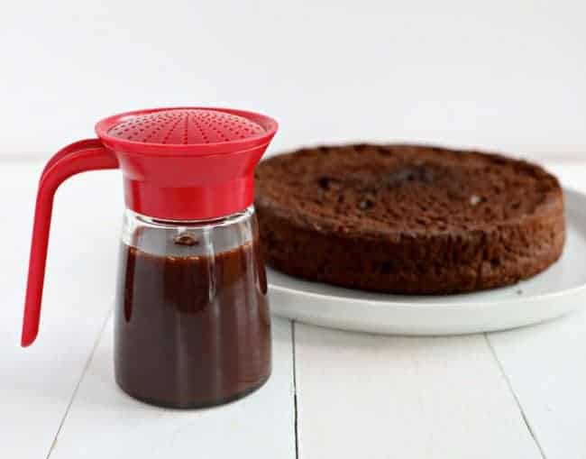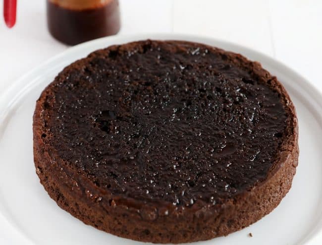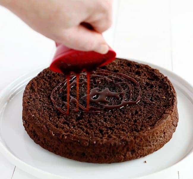 当你的蛋糕的烤箱,冷却到室温,夷为平地,如果需要,将简单的巧克力糖浆倒入蛋糕。数量不同,但我通常把整个蛋糕的顶部,使其吸收。